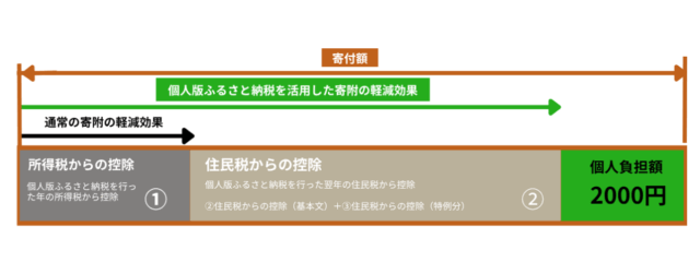 個人版ふるさと納税の場合、実質的な⾦銭⾯の追加負担がない形で応援したい地域・分野に対して寄付額のうち2,000円を超える分について、所得税・個人住民税が控除されます。