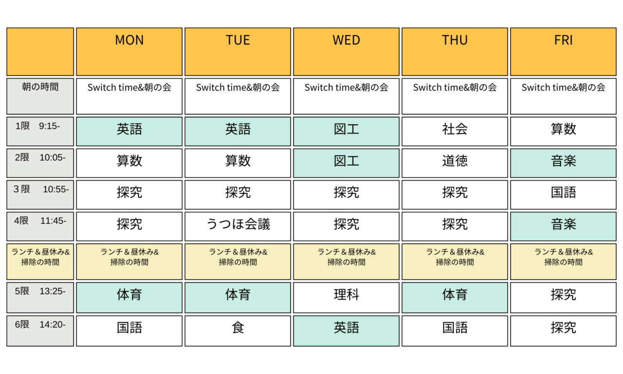 *英語の時間以外に、青く塗られている体育、音楽、図工の時間は英語が主体で教科を学びます。音楽、図工はそれぞれ専科の教員が授業を行います。