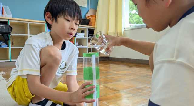 全ての教科は子どもたちの「なぜ?」から始まる問いや興味からはじまり、一人一人が主体となって探究し続ける探究的な授業です。豊かな言語力を身に付けるための読み書きや数の概念をしっかり学ぶ算数をはじめとする基礎学習と、6週間の時間を掛け教科横断でじっくり取り組むプロジェクト型の探究、英語をベースに学ぶ、体育・音楽・図工など、うつほの杜学園独自の特徴的な科目で構成されます。