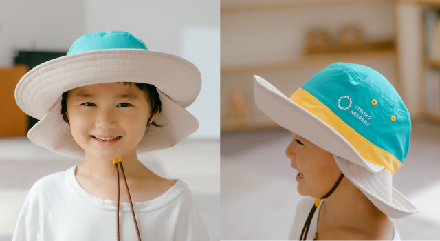 うつほの杜学園オリジナルの学園帽は、紫外線対策ウェアメーカーEPOCHALとの協働により生まれました。うつほカラーを使用し、冒険ハットをイメージしたデザインです。UVカット素材を使い、子ども達をしっかりと紫外線から守ってくれます。また内部には取り外し可能なプラスチックヘルメット素材を装着できる仕様です。