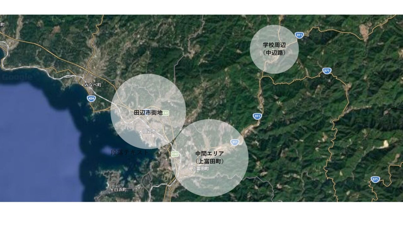 中間エリア(上富田町):学校まではスクールバスで20分ほどの距離に位置し、白浜町や田辺市のベットタウンとして半世紀以上にわたり人口が増え続けています。大型スーパー等も揃っており、利便性はありますが、車がないと病院等は不便するかと思います。